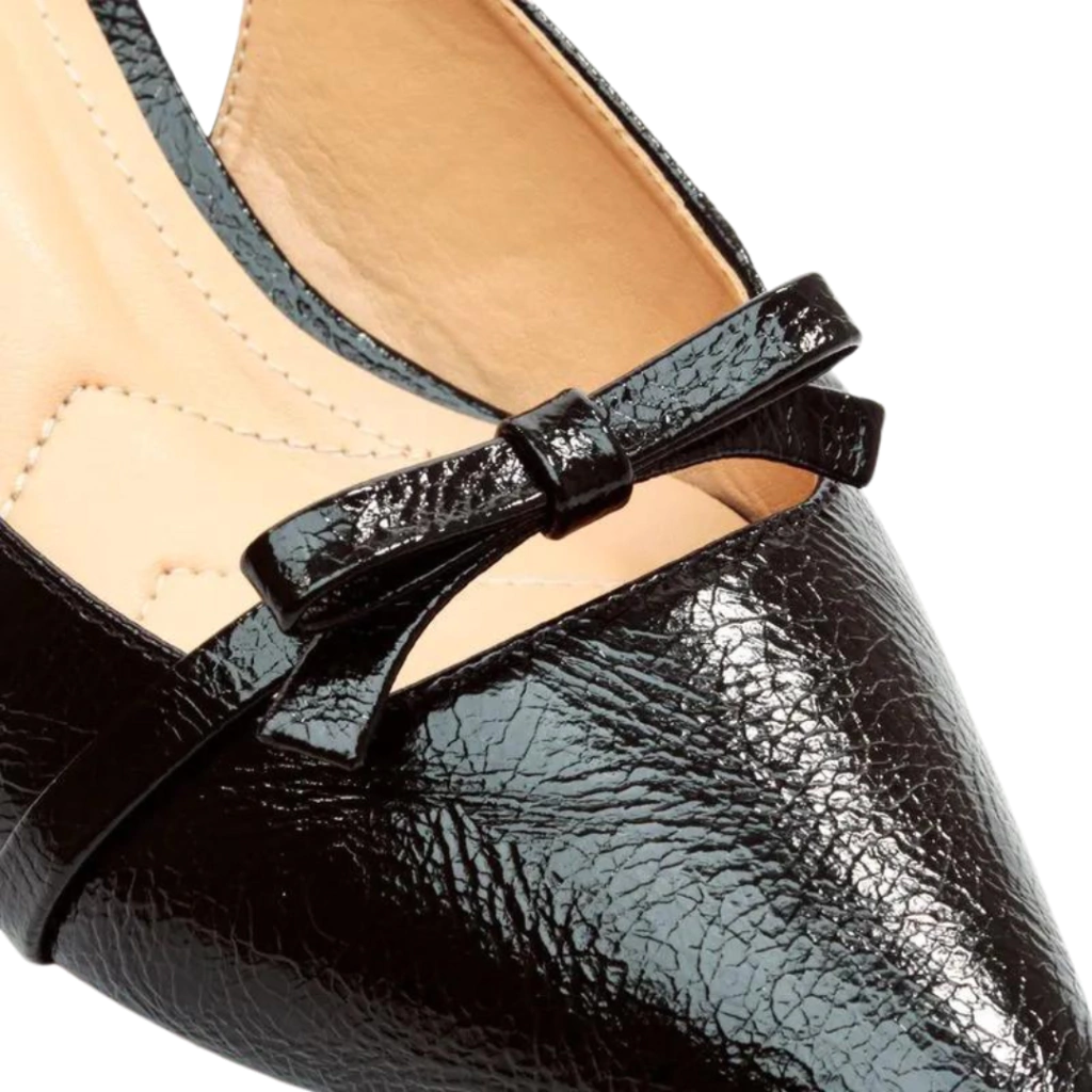 O bico fino confere uma silhueta elegante, enquanto o delicado laço no topo adiciona um charme sutil e refinado.